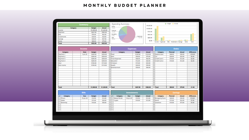 - The sheet automatically calculates totals and shows how much you’re spending vs. budgeting.